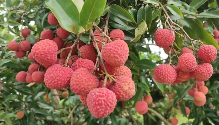 妃子笑荔枝以其绿中带红的果皮、个大、脆爽、清甜的口感著称,妃子笑又称为“白糖罂”,是广西最早的荔枝成熟品种之一。其果实在阳光下闪闪发光,味道甜美。华南农业大学的研究表明,妃子笑的果实中含有较高的花青素,具有很好的保健功效。